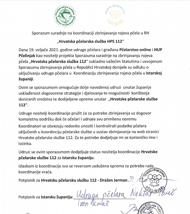 Član koordinacije Hrvatske pčelarske službe 112 Dražen Jerman u ime 'Hrvatske pčelarske službe 112' potpisao je sporazum sa udrugom Nektar iz Poreča.