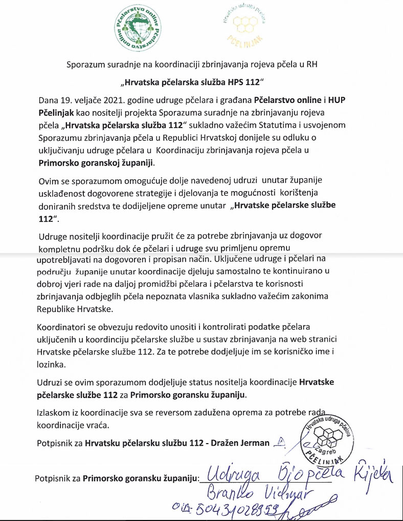 Član koordinacije Hrvatske pčelarske službe 112 Dražen Jerman u ime 'Hrvatske pčelarske službe 112' potpisao je sporazum sa udrugom Bio pčela iz Rijeke.