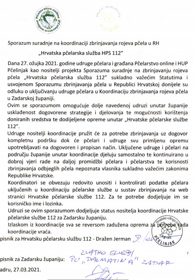 Član koordinacije Hrvatske pčelarske službe 112 Dražen Jerman 27.3.2021. godine u ime 'Hrvatske pčelarske službe 112' potpisao je sporazum sa udrugom Dalmatina iz Zadra.